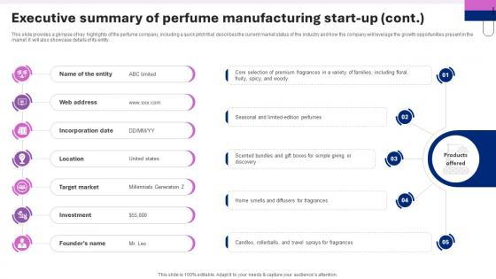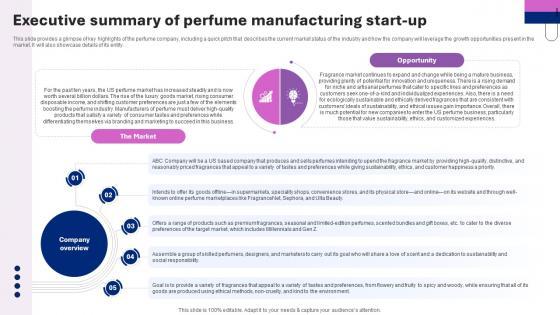 This slide provides a glimpse of key highlights of the perfume company, including a quick pitch that describes the current market status of the industry and how the company will leverage the growth opportunities present in the market. It will also showcase details of its entity. Do you have an important presentation coming up Are you looking for something that will make your presentation stand out from the rest Look no further than Perfume Manufacturing Business Plan Executive Summary Of Perfume Manufacturing Start Up BP SS V. With our professional designs, you can trust that your presentation will pop and make delivering it a smooth process. And with Slidegeeks, you can trust that your presentation will be unique and memorable. So why wait Grab Perfume Manufacturing Business Plan Executive Summary Of Perfume Manufacturing Start Up BP SS V today and make your presentation stand out from the rest This slide provides a glimpse of key highlights of the perfume company, including a quick pitch that describes the current market status of the industry and how the company will leverage the growth opportunities present in the market. It will also showcase details of its entity.