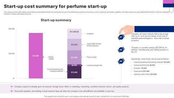 This slide provides information about start-up expenditures that incur during the process of establishing a perfume business, such as start-up ownership, legalities, and other expenses associated with the store. It will also highlight how the company will utilize its funds. This Perfume Manufacturing Business Plan Start Up Cost Summary For Perfume Start Up BP SS V from Slidegeeks makes it easy to present information on your topic with precision. It provides customization options, so you can make changes to the colors, design, graphics, or any other component to create a unique layout. It is also available for immediate download, so you can begin using it right away. Slidegeeks has done good research to ensure that you have everything you need to make your presentation stand out. Make a name out there for a brilliant performance. This slide provides information about start-up expenditures that incur during the process of establishing a perfume business, such as start-up ownership, legalities, and other expenses associated with the store. It will also highlight how the company will utilize its funds.