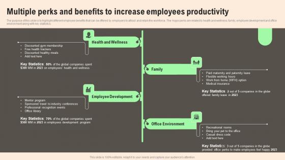The purpose of this slide is to highlight different employee benefits that can be offered by employers to attract and retain the workforce. The major perks are related to health and wellness, family, employee development and office environment along with key statistics. Find highly impressive Multiple Perks And Benefits To Increase Employees Productivity Themes PDF on Slidegeeks to deliver a meaningful presentation. You can save an ample amount of time using these presentation templates. No need to worry to prepare everything from scratch because Slidegeeks experts have already done a huge research and work for you. You need to download Multiple Perks And Benefits To Increase Employees Productivity Themes PDF for your upcoming presentation. All the presentation templates are 100 precent editable and you can change the color and personalize the content accordingly. Download now.