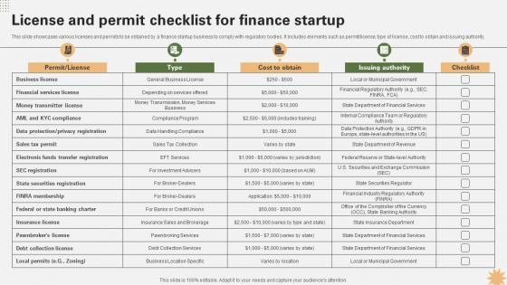 This slide showcases various licenses and permits to be obtained by a finance startup business to comply with regulatory bodies. It includes elements such as permitorlicense, type of license, cost to obtain and issuing authority. Explore a selection of the finest License And Permit Checklist For Finance Startup Penetrating Markets With Financial Strategy SS V here. With a plethora of professionally designed and pre made slide templates, you can quickly and easily find the right one for your upcoming presentation. You can use our License And Permit Checklist For Finance Startup Penetrating Markets With Financial Strategy SS V to effectively convey your message to a wider audience. Slidegeeks has done a lot of research before preparing these presentation templates. The content can be personalized and the slides are highly editable. Grab templates today from Slidegeeks. This slide showcases various licenses and permits to be obtained by a finance startup business to comply with regulatory bodies. It includes elements such as permitorlicense, type of license, cost to obtain and issuing authority.