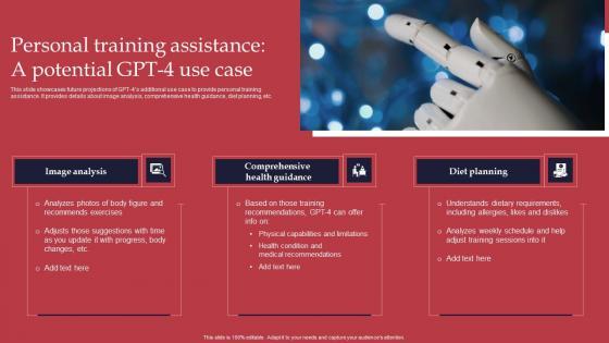 This slide showcases future projections of GPT 4s additional use case to provide personal training assistance. It provides details about image analysis, comprehensive health guidance, diet planning, etc. The best PPT templates are a great way to save time, energy, and resources. Slidegeeks have 100 percent editable powerpoint slides making them incredibly versatile. With these quality presentation templates, you can create a captivating and memorable presentation by combining visually appealing slides and effectively communicating your message. Download Personal Training Assistance GPT 4 Revolutionary Generative AI Innovation Summary Pdf from Slidegeeks and deliver a wonderful presentation. This slide showcases future projections of GPT 4s additional use case to provide personal training assistance. It provides details about image analysis, comprehensive health guidance, diet planning, etc.