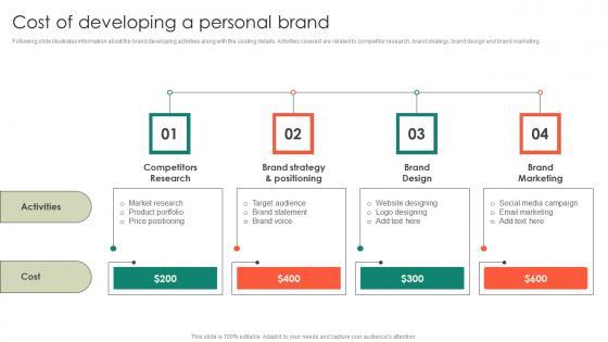 Following slide illustrates information about the brand developing activities along with the costing details. Activities covered are related to competitor research, brand strategy, brand design and brand marketing.Whether you have daily or monthly meetings, a brilliant presentation is necessary. Cost Of Developing A Personal Brand Entrepreneurs Roadmap To Effective Slides Pdf can be your best option for delivering a presentation. Represent everything in detail using Cost Of Developing A Personal Brand Entrepreneurs Roadmap To Effective Slides Pdf and make yourself stand out in meetings. The template is versatile and follows a structure that will cater to your requirements. All the templates prepared by Slidegeeks are easy to download and edit. Our research experts have taken care of the corporate themes as well. So, give it a try and see the results. Following slide illustrates information about the brand developing activities along with the costing details. Activities covered are related to competitor research, brand strategy, brand design and brand marketing.