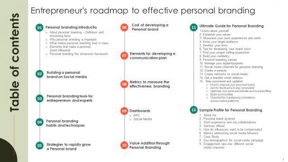 Slidegeeks is here to make your presentations a breeze with Table Of Contents Entrepreneurs Roadmap To Effective Personal Branding Structure Pdf With our easy-to-use and customizable templates, you can focus on delivering your ideas rather than worrying about formatting. With a variety of designs to choose from, you are sure to find one that suits your needs. And with animations and unique photos, illustrations, and fonts, you can make your presentation pop. So whether you are giving a sales pitch or presenting to the board, make sure to check out Slidegeeks first. Our Table Of Contents Entrepreneurs Roadmap To Effective Personal Branding Structure Pdf are topically designed to provide an attractive backdrop to any subject. Use them to look like a presentation pro.