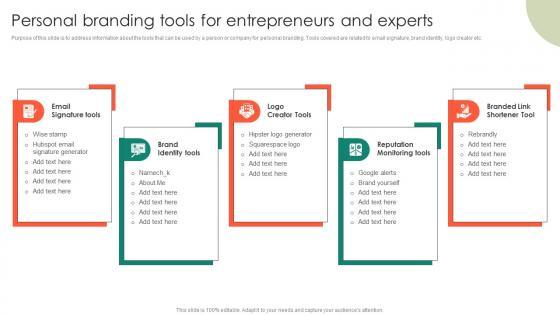 Purpose of this slide is to address information about the tools that can be used by a person or company for personal branding. Tools covered are related to email signature, brand identity, logo creator etc.Find a pre-designed and impeccable Personal Branding Tools For Entrepreneurs Entrepreneurs Roadmap To Effective Introduction Pdf. The templates can ace your presentation without additional effort. You can download these easy-to-edit presentation templates to make your presentation stand out from others. So, what are you waiting for Download the template from Slidegeeks today and give a unique touch to your presentation. Purpose of this slide is to address information about the tools that can be used by a person or company for personal branding. Tools covered are related to email signature, brand identity, logo creator etc.