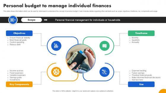 This slide shows information which can be used by individuals to understand the concept of personal budget. It also includes details regarding other elements such as scope, objectives, timeframe, key components and usage. Here you can discover an assortment of the finest PowerPoint and Google Slides templates. With these templates, you can create presentations for a variety of purposes while simultaneously providing your audience with an eye-catching visual experience. Download Personal Budget To Manage Individual Finances Effective And Efficient Tools To Develop Fin SS V to deliver an impeccable presentation. These templates will make your job of preparing presentations much quicker, yet still, maintain a high level of quality. Slidegeeks has experienced researchers who prepare these templates and write high-quality content for you. Later on, you can personalize the content by editing the Personal Budget To Manage Individual Finances Effective And Efficient Tools To Develop Fin SS V. This slide shows information which can be used by individuals to understand the concept of personal budget. It also includes details regarding other elements such as scope, objectives, timeframe, key components and usage.