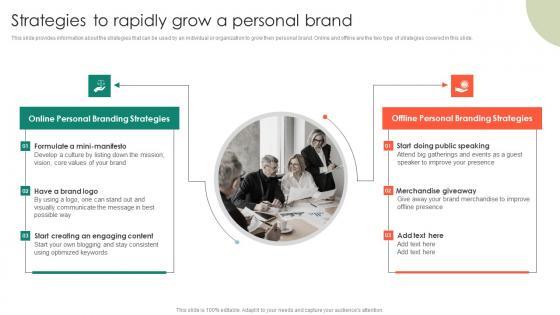 This slide provides information about the strategies that can be used by an individual or organization to grow their personal brand. Online and offline are the two type of strategies covered in this slide.Present like a pro with Strategies To Rapidly Grow A Personal Entrepreneurs Roadmap To Effective Rules Pdf Create beautiful presentations together with your team, using our easy-to-use presentation slides. Share your ideas in real-time and make changes on the fly by downloading our templates. So whether you are in the office, on the go, or in a remote location, you can stay in sync with your team and present your ideas with confidence. With Slidegeeks presentation got a whole lot easier. Grab these presentations today. This slide provides information about the strategies that can be used by an individual or organization to grow their personal brand. Online and offline are the two type of strategies covered in this slide.
