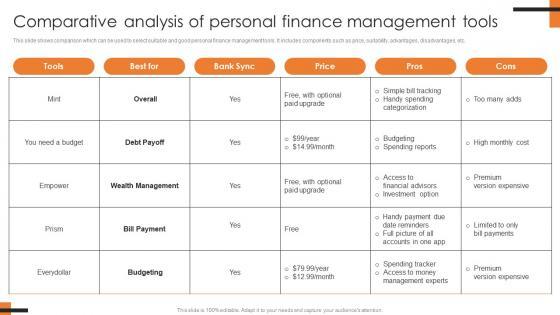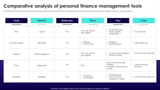 This slide shows comparison which can be used to select suitable and good personal finance management tools. It includes components such as price, suitability, advantages, disadvantages, etc. Coming up with a presentation necessitates that the majority of the effort goes into the content and the message you intend to convey. The visuals of a PowerPoint presentation can only be effective if it supplements and supports the story that is being told. Keeping this in mind our experts created Wireless Banking To Improve Digital Comparative Analysis Of Personal Finance Fin SS V to reduce the time that goes into designing the presentation. This way, you can concentrate on the message while our designers take care of providing you with the right template for the situation. This slide shows comparison which can be used to select suitable and good personal finance management tools. It includes components such as price, suitability, advantages, disadvantages, etc.