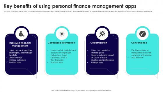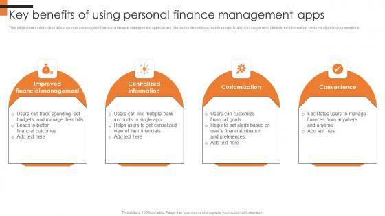 This slide shows information about various advantages of personal finance management applications. It includes benefits such as improved financial management, centralized information, customization and convenience. Presenting this PowerPoint presentation, titled Key Benefits Of Using Personal Finance Management Comprehensive Smartphone Banking Formats Pdf, with topics curated by our researchers after extensive research. This editable presentation is available for immediate download and provides attractive features when used. Download now and captivate your audience. Presenting this Key Benefits Of Using Personal Finance Management Comprehensive Smartphone Banking Formats Pdf. Our researchers have carefully researched and created these slides with all aspects taken into consideration. This is a completely customizable Key Benefits Of Using Personal Finance Management Comprehensive Smartphone Banking Formats Pdf that is available for immediate downloading. Download now and make an impact on your audience. Highlight the attractive features available with our PPTs. This slide shows information about various advantages of personal finance management applications. It includes benefits such as improved financial management, centralized information, customization and convenience.
