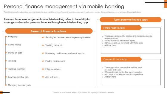 This slide shows information about which can be used to understand the concept of personal finance management through mobile banking. It includes types as well as functions of these applications. Do you have an important presentation coming up Are you looking for something that will make your presentation stand out from the rest Look no further than Wireless Banking To Improve Personal Finance Management Via Mobile Banking Fin SS V. With our professional designs, you can trust that your presentation will pop and make delivering it a smooth process. And with Slidegeeks, you can trust that your presentation will be unique and memorable. So why wait Grab Wireless Banking To Improve Personal Finance Management Via Mobile Banking Fin SS V today and make your presentation stand out from the rest This slide shows information about which can be used to understand the concept of personal finance management through mobile banking. It includes types as well as functions of these applications.