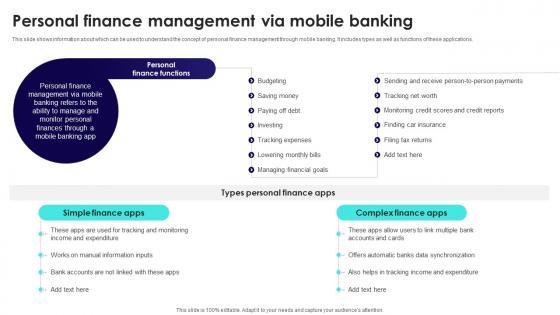 This slide shows information about which can be used to understand the concept of personal finance management through mobile banking. It includes types as well as functions of these applications.Present like a pro with Personal Finance Management Via Mobile Banking Comprehensive Smartphone Banking Guidelines Pdf Create beautiful presentations together with your team, using our easy-to-use presentation slides. Share your ideas in real-time and make changes on the fly by downloading our templates. So whether you are in the office, on the go, or in a remote location, you can stay in sync with your team and present your ideas with confidence. With Slidegeeks presentation got a whole lot easier. Grab these presentations today. This slide shows information about which can be used to understand the concept of personal finance management through mobile banking. It includes types as well as functions of these applications.