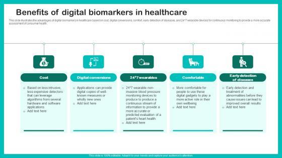 This slide illustrates the advantages of digital biomarkers in healthcare based on cost, digital conversions, comfort, early detection of diseases, and 24 7 wearable devices for continuous monitoring to provide a more accurate assessment of consumer health. This Benefits Of Digital Biomarkers Digital Biomarkers For Personalized Health Insights Guidelines Pdf from Slidegeeks makes it easy to present information on your topic with precision. It provides customization options, so you can make changes to the colors, design, graphics, or any other component to create a unique layout. It is also available for immediate download, so you can begin using it right away. Slidegeeks has done good research to ensure that you have everything you need to make your presentation stand out. Make a name out there for a brilliant performance. This slide illustrates the advantages of digital biomarkers in healthcare based on cost, digital conversions, comfort, early detection of diseases, and 24 7 wearable devices for continuous monitoring to provide a more accurate assessment of consumer health.