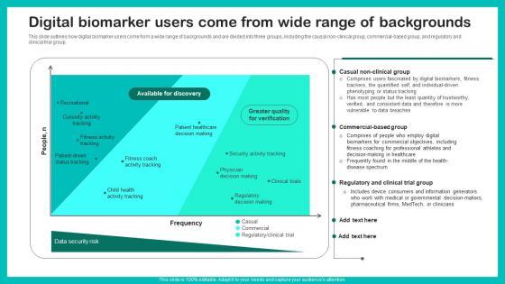 This slide outlines how digital biomarker users come from a wide range of backgrounds and are divided into three groups, including the causal non clinical group, commercial based group, and regulatory and clinical trial group. Want to ace your presentation in front of a live audience Our Digital Biomarker Users Come Digital Biomarkers For Personalized Health Insights Summary Pdf can help you do that by engaging all the users towards you. Slidegeeks experts have put their efforts and expertise into creating these impeccable powerpoint presentations so that you can communicate your ideas clearly. Moreover, all the templates are customizable, and easy to edit and downloadable. Use these for both personal and commercial use. This slide outlines how digital biomarker users come from a wide range of backgrounds and are divided into three groups, including the causal non clinical group, commercial based group, and regulatory and clinical trial group.