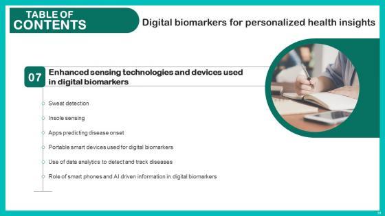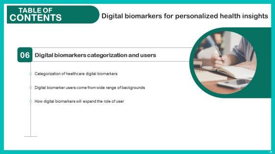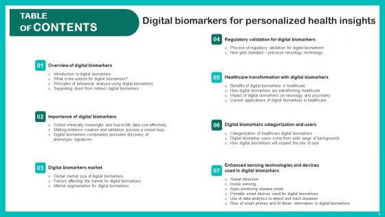 Do you know about Slidesgeeks Table Of Contents Digital Biomarkers For Personalized Health Insights Mockup Pdf These are perfect for delivering any kind od presentation. Using it, create PowerPoint presentations that communicate your ideas and engage audiences. Save time and effort by using our pre designed presentation templates that are perfect for a wide range of topic. Our vast selection of designs covers a range of styles, from creative to business, and are all highly customizable and easy to edit. Download as a PowerPoint template or use them as Google Slides themes. Our Table Of Contents Digital Biomarkers For Personalized Health Insights Mockup Pdf are topically designed to provide an attractive backdrop to any subject. Use them to look like a presentation pro.