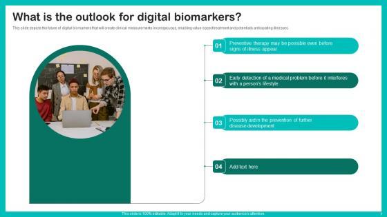This slide depicts the future of digital biomarkers that will create clinical measurements inconspicuous, enabling value based treatment and potentially anticipating illnesses. Create an editable What Is The Outlook Digital Biomarkers For Personalized Health Insights Mockup Pdf that communicates your idea and engages your audience. Whether you are presenting a business or an educational presentation, pre designed presentation templates help save time. What Is The Outlook Digital Biomarkers For Personalized Health Insights Mockup Pdf is highly customizable and very easy to edit, covering many different styles from creative to business presentations. Slidegeeks has creative team members who have crafted amazing templates. So, go and get them without any delay. This slide depicts the future of digital biomarkers that will create clinical measurements inconspicuous, enabling value based treatment and potentially anticipating illnesses.