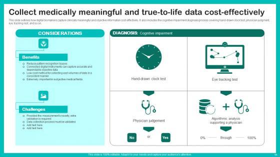 This slide outlines how digital biomarkers capture clinically meaningful and objective information cost effectively. It also includes the cognitive impairment diagnosis process covering hand drawn clock test, physician judgment, eye tracking rest, and so on. Boost your pitch with our creative Collect Medically Meaningful Digital Biomarkers For Personalized Health Insights Icons Pdf. Deliver an awe inspiring pitch that will mesmerize everyone. Using these presentation templates you will surely catch everyones attention. You can browse the ppts collection on our website. We have researchers who are experts at creating the right content for the templates. So you do not have to invest time in any additional work. Just grab the template now and use them. This slide outlines how digital biomarkers capture clinically meaningful and objective information cost effectively. It also includes the cognitive impairment diagnosis process covering hand drawn clock test, physician judgment, eye tracking rest, and so on.