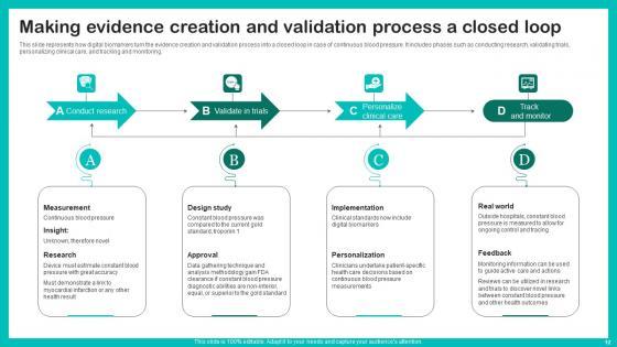 This slide represents how digital biomarkers turn the evidence creation and validation process into a closed loop in case of continuous blood pressure. It includes phases such as conducting research, validating trials, personalizing clinical care, and tracking and monitoring. This Making Evidence Creation Digital Biomarkers For Personalized Health Insights Diagrams Pdf is perfect for any presentation, be it in front of clients or colleagues. It is a versatile and stylish solution for organizing your meetings. The Making Evidence Creation Digital Biomarkers For Personalized Health Insights Diagrams Pdf features a modern design for your presentation meetings. The adjustable and customizable slides provide unlimited possibilities for acing up your presentation. Slidegeeks has done all the homework before launching the product for you. So, do not wait, grab the presentation templates today This slide represents how digital biomarkers turn the evidence creation and validation process into a closed loop in case of continuous blood pressure. It includes phases such as conducting research, validating trials, personalizing clinical care, and tracking and monitoring.