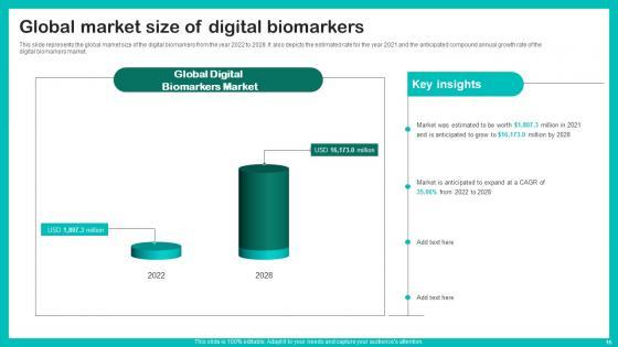 This slide represents the global market size of the digital biomarkers from the year 2022 to 2028. It also depicts the estimated rate for the year 2021 and the anticipated compound annual growth rate of the digital biomarkers market. If your project calls for a presentation, then Slidegeeks is your go to partner because we have professionally designed, easy to edit templates that are perfect for any presentation. After downloading, you can easily edit Global Market Size Of Digital Biomarkers For Personalized Health Insights Sample Pdf and make the changes accordingly. You can rearrange slides or fill them with different images. Check out all the handy templates This slide represents the global market size of the digital biomarkers from the year 2022 to 2028. It also depicts the estimated rate for the year 2021 and the anticipated compound annual growth rate of the digital biomarkers market.