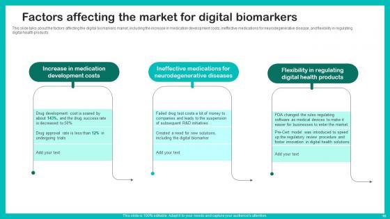 This slide talks about the factors affecting the digital biomarkers market, including the increase in medication development costs, ineffective medications for neurodegenerative disease, and flexibility in regulating digital health products. Find highly impressive Factors Affecting The Market Digital Biomarkers For Personalized Health Insights Sample Pdf on Slidegeeks to deliver a meaningful presentation. You can save an ample amount of time using these presentation templates. No need to worry to prepare everything from scratch because Slidegeeks experts have already done a huge research and work for you. You need to download Factors Affecting The Market Digital Biomarkers For Personalized Health Insights Sample Pdf for your upcoming presentation. All the presentation templates are 100 percent editable and you can change the color and personalize the content accordingly. Download now This slide talks about the factors affecting the digital biomarkers market, including the increase in medication development costs, ineffective medications for neurodegenerative disease, and flexibility in regulating digital health products.