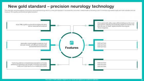 This slide talks about the features of precision neurology technology which is a new gold standard. It assesses the consumers mental health by following a set of immersive augmented reality and motor activities and can measure 790 cognitive and functional digital indicators. The best PPT templates are a great way to save time, energy, and resources. Slidegeeks have 100 percent editable powerpoint slides making them incredibly versatile. With these quality presentation templates, you can create a captivating and memorable presentation by combining visually appealing slides and effectively communicating your message. Download New Gold Standard Precision Digital Biomarkers For Personalized Health Insights Brochure Pdf from Slidegeeks and deliver a wonderful presentation. This slide talks about the features of precision neurology technology which is a new gold standard. It assesses the consumers mental health by following a set of immersive augmented reality and motor activities and can measure 790 cognitive and functional digital indicators.
