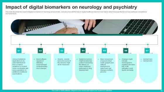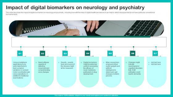 This slide describes the impact of digital biomarkers on neurology and psychiatry, including how with the help of digital healthcare devices it can help to detect diseases that do not have particular conventional biomarker tests. Crafting an eye catching presentation has never been more straightforward. Let your presentation shine with this tasteful yet straightforward Impact Of Digital Biomarkers Digital Biomarkers For Personalized Health Insights Diagrams Pdf template. It offers a minimalistic and classy look that is great for making a statement. The colors have been employed intelligently to add a bit of playfulness while still remaining professional. Construct the ideal Impact Of Digital Biomarkers Digital Biomarkers For Personalized Health Insights Diagrams Pdf that effortlessly grabs the attention of your audience Begin now and be certain to wow your customers This slide describes the impact of digital biomarkers on neurology and psychiatry, including how with the help of digital healthcare devices it can help to detect diseases that do not have particular conventional biomarker tests.