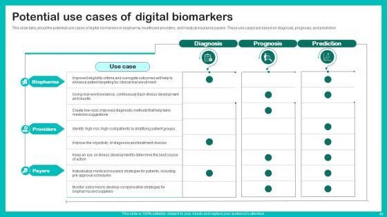 This slide talks about the potential use cases of digital biomarkers in biopharma, healthcare providers, and medical insurance payers. These use cases are based on diagnosis, prognosis, and prediction. Retrieve professionally designed Potential Use Cases Digital Biomarkers For Personalized Health Insights Structure Pdf to effectively convey your message and captivate your listeners. Save time by selecting pre made slideshows that are appropriate for various topics, from business to educational purposes. These themes come in many different styles, from creative to corporate, and all of them are easily adjustable and can be edited quickly. Access them as PowerPoint templates or as Google Slides themes. You do not have to go on a hunt for the perfect presentation because Slidegeeks got you covered from everywhere. This slide talks about the potential use cases of digital biomarkers in biopharma, healthcare providers, and medical insurance payers. These use cases are based on diagnosis, prognosis, and prediction.