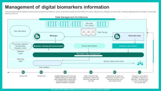 This slide represents the digital biomarkers data management architecture, and its components include raw information from assays, data parsing, metadata, biomarker data, metadata cataloguing and harmonization, clinical data pipeline, and so on Welcome to our selection of the Management Of Digital Biomarkers Digital Biomarkers For Personalized Health Insights Slides Pdf. These are designed to help you showcase your creativity and bring your sphere to life. Planning and Innovation are essential for any business that is just starting out. This collection contains the designs that you need for your everyday presentations. All of our PowerPoints are 100 percent editable, so you can customize them to suit your needs. This multi purpose template can be used in various situations. Grab these presentation templates today This slide represents the digital biomarkers data management architecture, and its components include raw information from assays, data parsing, metadata, biomarker data, metadata cataloguing and harmonization, clinical data pipeline, and so on
