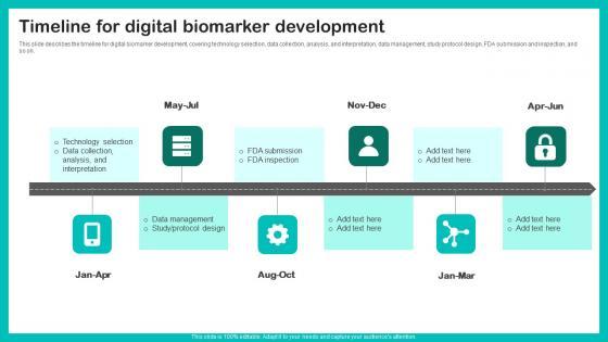 This slide describes the timeline for digital biomarker development, covering technology selection, data collection, analysis, and interpretation, data management, study protocol design, FDA submission and inspection, and so on. qFind a pre designed and impeccable Timeline For Digital Biomarker Digital Biomarkers For Personalized Health Insights Summary Pdf. The templates can ace your presentation without additional effort. You can download these easy to edit presentation templates to make your presentation stand out from others. So, what are you waiting for Download the template from Slidegeeks today and give a unique touch to your presentation. This slide describes the timeline for digital biomarker development, covering technology selection, data collection, analysis, and interpretation, data management, study protocol design, FDA submission and inspection, and so on.