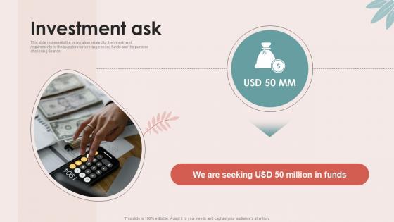 This slide represents the information related to the investment requirements to the investors for seeking needed funds and the purpose of seeking finance. Find highly impressive Investment Ask Personal Care Company Investor Ppt Sample on Slidegeeks to deliver a meaningful presentation. You can save an ample amount of time using these presentation templates. No need to worry to prepare everything from scratch because Slidegeeks experts have already done a huge research and work for you. You need to download Investment Ask Personal Care Company Investor Ppt Sample for your upcoming presentation. All the presentation templates are 100 percent editable and you can change the color and personalize the content accordingly. Download now This slide represents the information related to the investment requirements to the investors for seeking needed funds and the purpose of seeking finance.