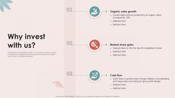 This purpose of the following slide is to convince investors to invest in business by highlighting business growth potential and benefits they will get by making investment. The best PPT templates are a great way to save time, energy, and resources. Slidegeeks have 100 percent editable powerpoint slides making them incredibly versatile. With these quality presentation templates, you can create a captivating and memorable presentation by combining visually appealing slides and effectively communicating your message. Download Why Invest With Us Personal Care Company Investor Ppt Slides from Slidegeeks and deliver a wonderful presentation. This purpose of the following slide is to convince investors to invest in business by highlighting business growth potential and benefits they will get by making investment.
