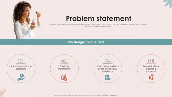 This slide showcases identified problems that consumers commonly face during product purchase. Challenges are convenience, quality and performance, safety and affordability. Formulating a presentation can take up a lot of effort and time, so the content and message should always be the primary focus. The visuals of the PowerPoint can enhance the presenters message, so our Problem Statement Personal Care Company Investor Ppt Slides was created to help save time. Instead of worrying about the design, the presenter can concentrate on the message while our designers work on creating the ideal templates for whatever situation is needed. Slidegeeks has experts for everything from amazing designs to valuable content, we have put everything into Problem Statement Personal Care Company Investor Ppt Slides This slide showcases identified problems that consumers commonly face during product purchase. Challenges are convenience, quality and performance, safety and affordability.