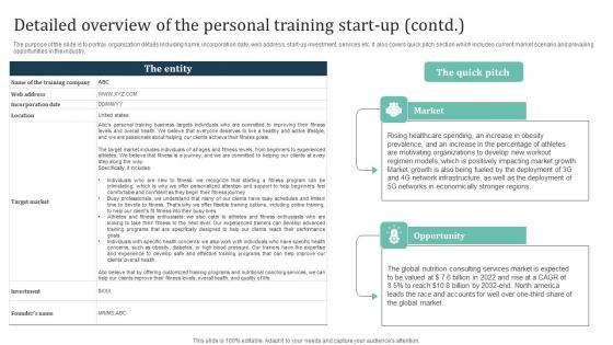 The purpose of the slide is to portray organization details including name, incorporation date, web address, start-up investment, services etc. It also covers quick pitch section which includes current market scenario and prevailing opportunities in the industry. Welcome to our selection of the Detailed Overview Of The Personal Training Start Up Group Training Business Information Pdf These are designed to help you showcase your creativity and bring your sphere to life. Planning and Innovation are essential for any business that is just starting out. This collection contains the designs that you need for your everyday presentations. All of our PowerPoints are 100 percent editable, so you can customize them to suit your needs. This multi-purpose template can be used in various situations. Grab these presentation templates today. The purpose of the slide is to portray organization details including name, incorporation date, web address, start-up investment, services etc. It also covers quick pitch section which includes current market scenario and prevailing opportunities in the industry.