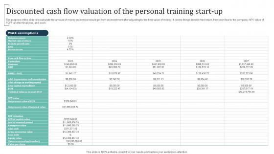 The purpose of this slide is to calculate the amount of money an investor would get from an investment after adjusting for the time value of money. It covers things like risk-free return, free cash flow to the company, NPV value of FCFF and terminal year, and soon. The Discounted Cash Flow Valuation Of The Personal Training Group Training Business Ideas Pdf is a compilation of the most recent design trends as a series of slides. It is suitable for any subject or industry presentation, containing attractive visuals and photo spots for businesses to clearly express their messages. This template contains a variety of slides for the user to input data, such as structures to contrast two elements, bullet points, and slides for written information. Slidegeeks is prepared to create an impression. The purpose of this slide is to calculate the amount of money an investor would get from an investment after adjusting for the time value of money. It covers things like risk-free return, free cash flow to the company, NPV value of FCFF and terminal year, and soon.
