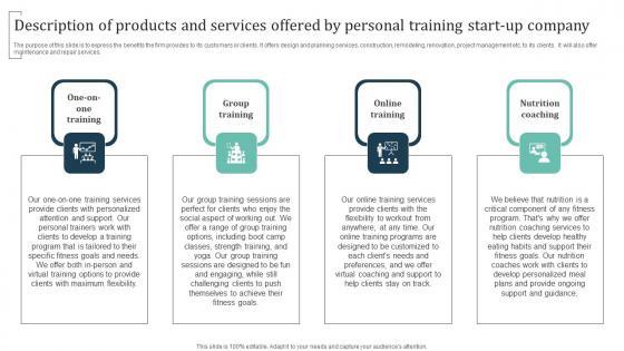 The purpose of this slide is to express the benefits the firm provides to its customers or clients. It offers design and planning services, construction, remodeling, renovation, project management etc. to its clients. It will also offer maintenance and repair services. This Description Of Products And Services Offered By Personal Group Training Business Ideas Pdf is perfect for any presentation, be it in front of clients or colleagues. It is a versatile and stylish solution for organizing your meetings. The Description Of Products And Services Offered By Personal Group Training Business Ideas Pdf features a modern design for your presentation meetings. The adjustable and customizable slides provide unlimited possibilities for acing up your presentation. Slidegeeks has done all the homework before launching the product for you. So, do not wait, grab the presentation templates today The purpose of this slide is to express the benefits the firm provides to its customers or clients. It offers design and planning services, construction, remodeling, renovation, project management etc. to its clients. It will also offer maintenance and repair services.