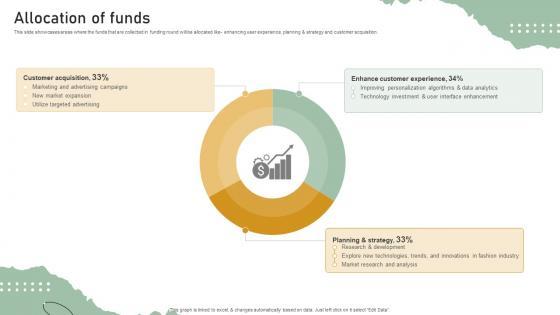 This slide showcases areas where the funds that are collected in funding round will be allocated like- enhancing user experience, planning and strategy and customer acquisition. Find a pre-designed and impeccable Allocation Of Funds Personal Styling Service Investor Funding Elevator Pitch Deck. The templates can ace your presentation without additional effort. You can download these easy-to-edit presentation templates to make your presentation stand out from others. So, what are you waiting for Download the template from Slidegeeks today and give a unique touch to your presentation. This slide showcases areas where the funds that are collected in funding round will be allocated like- enhancing user experience, planning and strategy and customer acquisition.