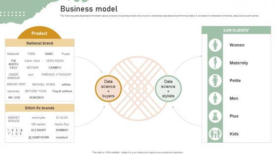 The following slide illustrates information about companys business model showing how enterprise operates and perform key tasks. It consists of combination of brands, data science and clients. Boost your pitch with our creative Business Model Personal Styling Service Investor Funding Elevator Pitch Deck. Deliver an awe-inspiring pitch that will mesmerize everyone. Using these presentation templates you will surely catch everyones attention. You can browse the ppts collection on our website. We have researchers who are experts at creating the right content for the templates. So you do not have to invest time in any additional work. Just grab the template now and use them. The following slide illustrates information about companys business model showing how enterprise operates and perform key tasks. It consists of combination of brands, data science and clients.