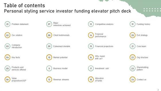 Welcome to our selection of the Table Of Contents Personal Styling Service Investor Funding Elevator Pitch Deck. These are designed to help you showcase your creativity and bring your sphere to life. Planning and Innovation are essential for any business that is just starting out. This collection contains the designs that you need for your everyday presentations. All of our PowerPoints are 100 percent editable, so you can customize them to suit your needs. This multi-purpose template can be used in various situations. Grab these presentation templates today. Our Table Of Contents Personal Styling Service Investor Funding Elevator Pitch Deck are topically designed to provide an attractive backdrop to any subject. Use them to look like a presentation pro.