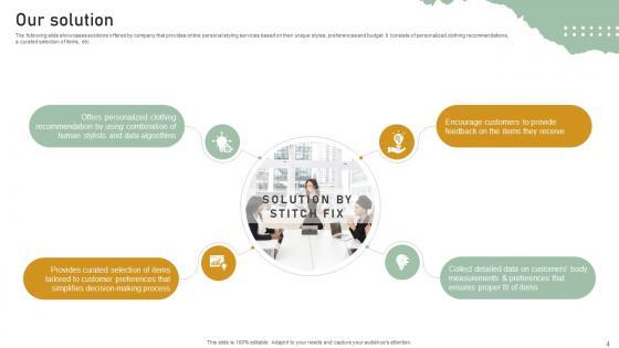 The following slide showcases solutions offered by company that provides online personal styling services based on their unique styles, preferences and budget. It consists of personalized clothing recommendations,a curated selection of items, etc. Make sure to capture your audiences attention in your business displays with our gratis customizable Our Solution Personal Styling Service Investor Funding Elevator Pitch Deck. These are great for business strategies, office conferences, capital raising or task suggestions. If you desire to acquire more customers for your tech business and ensure they stay satisfied, create your own sales presentation with these plain slides. The following slide showcases solutions offered by company that provides online personal styling services based on their unique styles, preferences and budget. It consists of personalized clothing recommendations,a curated selection of items, etc.