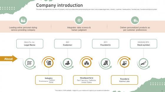 This slide represents the overview of company which provides online personal styling services. It showcases legal name, industry, customer, headquarters, founded year, founders and stock symbol.Slidegeeks is one of the best resources for PowerPoint templates. You can download easily and regulate Company Introduction Personal Styling Service Investor Funding Elevator Pitch Deck for your personal presentations from our wonderful collection. A few clicks is all it takes to discover and get the most relevant and appropriate templates. Use our Templates to add a unique zing and appeal to your presentation and meetings. All the slides are easy to edit and you can use them even for advertisement purposes. This slide represents the overview of company which provides online personal styling services. It showcases legal name, industry, customer, headquarters, founded year, founders and stock symbol.