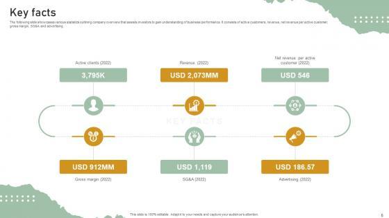 The following slide showcases various statistics outlining company overview that assists investors to gain understanding of business performance. It consists of active customers, revenue, net revenue per active customer, gross margin, SGandA and advertising. If your project calls for a presentation, then Slidegeeks is your go-to partner because we have professionally designed, easy-to-edit templates that are perfect for any presentation. After downloading, you can easily edit Key Facts Personal Styling Service Investor Funding Elevator Pitch Deck and make the changes accordingly. You can rearrange slides or fill them with different images. Check out all the handy templates The following slide showcases various statistics outlining company overview that assists investors to gain understanding of business performance. It consists of active customers, revenue, net revenue per active customer, gross margin, SGandA and advertising.