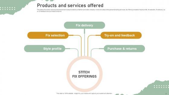 This slide shows the various products and services provided by a fashion and retail company which provides online personal styling services. Its offering consists of style profile, fix selection, fix delivery, try on and feedback and purchase and returns. Coming up with a presentation necessitates that the majority of the effort goes into the content and the message you intend to convey. The visuals of a PowerPoint presentation can only be effective if it supplements and supports the story that is being told. Keeping this in mind our experts created Products And Services Offered Personal Styling Service Investor Funding Elevator Pitch Deck to reduce the time that goes into designing the presentation. This way, you can concentrate on the message while our designers take care of providing you with the right template for the situation. This slide shows the various products and services provided by a fashion and retail company which provides online personal styling services. Its offering consists of style profile, fix selection, fix delivery, try on and feedback and purchase and returns.