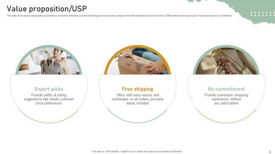 This slide showcases unique selling propositions of solution offered by a personal styling service providing company that differentiates product from others. Differentiators are expert picks, free shipping and no commitment. Explore a selection of the finest Value Proposition Usp Personal Styling Service Investor Funding Elevator Pitch Deck here. With a plethora of professionally designed and pre-made slide templates, you can quickly and easily find the right one for your upcoming presentation. You can use our Value Proposition Usp Personal Styling Service Investor Funding Elevator Pitch Deck to effectively convey your message to a wider audience. Slidegeeks has done a lot of research before preparing these presentation templates. The content can be personalized and the slides are highly editable. Grab templates today from Slidegeeks. This slide showcases unique selling propositions of solution offered by a personal styling service providing company that differentiates product from others. Differentiators are expert picks, free shipping and no commitment.