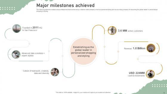 The following slide showcases various milestones that is achieved by a fashion retail company which is a personal styling service providing company for becoming the global leader in personalized shopping and styling. If you are looking for a format to display your unique thoughts, then the professionally designed Major Milestones Achieved Personal Styling Service Investor Funding Elevator Pitch Deck is the one for you. You can use it as a Google Slides template or a PowerPoint template. Incorporate impressive visuals, symbols, images, and other charts. Modify or reorganize the text boxes as you desire. Experiment with shade schemes and font pairings. Alter, share or cooperate with other people on your work. Download Major Milestones Achieved Personal Styling Service Investor Funding Elevator Pitch Deck and find out how to give a successful presentation. Present a perfect display to your team and make your presentation unforgettable. The following slide showcases various milestones that is achieved by a fashion retail company which is a personal styling service providing company for becoming the global leader in personalized shopping and styling.