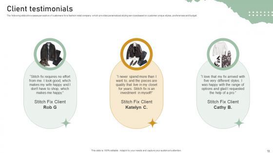 The following slide showcases perceptive of customers for a fashion retail company which provides personalized styling services based on customer unique styles, preferences and budget. Create an editable Client Testimonials Personal Styling Service Investor Funding Elevator Pitch Deck that communicates your idea and engages your audience. Whether you are presenting a business or an educational presentation, pre-designed presentation templates help save time. Client Testimonials Personal Styling Service Investor Funding Elevator Pitch Deck is highly customizable and very easy to edit, covering many different styles from creative to business presentations. Slidegeeks has creative team members who have crafted amazing templates. So, go and get them without any delay. The following slide showcases perceptive of customers for a fashion retail company which provides personalized styling services based on customer unique styles, preferences and budget.