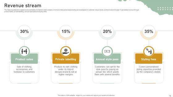 The following slide showcases revenue streams of a fashion retail company which provides personalized styling services based on customer unique styles, preferences and budget. It generates revenue through product sales, private labelling, annual style pass and styling fees. This modern and well-arranged Revenue Stream Personal Styling Service Investor Funding Elevator Pitch Deck provides lots of creative possibilities. It is very simple to customize and edit with the Powerpoint Software. Just drag and drop your pictures into the shapes. All facets of this template can be edited with Powerpoint, no extra software is necessary. Add your own material, put your images in the places assigned for them, adjust the colors, and then you can show your slides to the world, with an animated slide included. The following slide showcases revenue streams of a fashion retail company which provides personalized styling services based on customer unique styles, preferences and budget. It generates revenue through product sales, private labelling, annual style pass and styling fees.