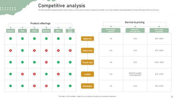 The following slide will assist a fashion retail company in showing the investors or audience a complete view of its competitive landscape based on product offerings and service and pricing. Want to ace your presentation in front of a live audience Our Competitive Analysis Personal Styling Service Investor Funding Elevator Pitch Deck can help you do that by engaging all the users towards you. Slidegeeks experts have put their efforts and expertise into creating these impeccable powerpoint presentations so that you can communicate your ideas clearly. Moreover, all the templates are customizable, and easy-to-edit and downloadable. Use these for both personal and commercial use. The following slide will assist a fashion retail company in showing the investors or audience a complete view of its competitive landscape based on product offerings and service and pricing.