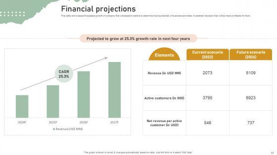This slide showcases forecasted growth of company that will assist investors to determine future potential of business and make investment decision that will be most profitable for them.Slidegeeks is here to make your presentations a breeze with Financial Projections Personal Styling Service Investor Funding Elevator Pitch Deck With our easy-to-use and customizable templates, you can focus on delivering your ideas rather than worrying about formatting. With a variety of designs to choose from, you are sure to find one that suits your needs. And with animations and unique photos, illustrations, and fonts, you can make your presentation pop. So whether you are giving a sales pitch or presenting to the board, make sure to check out Slidegeeks first This slide showcases forecasted growth of company that will assist investors to determine future potential of business and make investment decision that will be most profitable for them.
