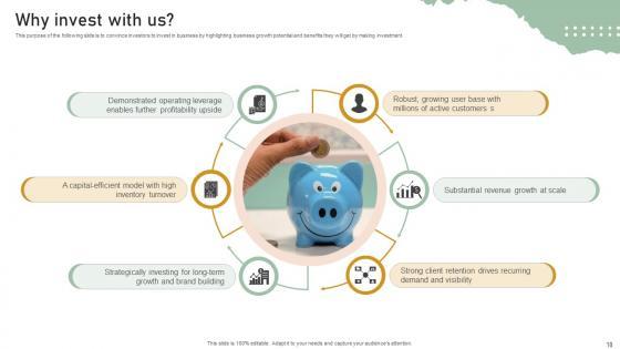 This purpose of the following slide is to convince investors to invest in business by highlighting business growth potential and benefits they will get by making investment. The best PPT templates are a great way to save time, energy, and resources. Slidegeeks have 100 percent editable powerpoint slides making them incredibly versatile. With these quality presentation templates, you can create a captivating and memorable presentation by combining visually appealing slides and effectively communicating your message. Download Why Invest With Us Personal Styling Service Investor Funding Elevator Pitch Deck from Slidegeeks and deliver a wonderful presentation. This purpose of the following slide is to convince investors to invest in business by highlighting business growth potential and benefits they will get by making investment.