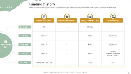 This slide showcases timeframe of funding rounds of a fashion retail company along with announced date, transaction name, number of investors, money raised and lead investors. Do you have an important presentation coming up Are you looking for something that will make your presentation stand out from the rest Look no further than Funding History Personal Styling Service Investor Funding Elevator Pitch Deck. With our professional designs, you can trust that your presentation will pop and make delivering it a smooth process. And with Slidegeeks, you can trust that your presentation will be unique and memorable. So why wait Grab Funding History Personal Styling Service Investor Funding Elevator Pitch Deck today and make your presentation stand out from the rest This slide showcases timeframe of funding rounds of a fashion retail company along with announced date, transaction name, number of investors, money raised and lead investors.