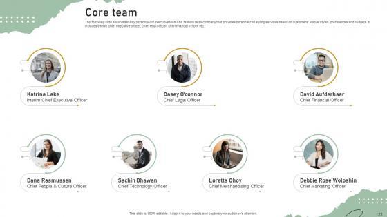 The following slide showcases key personnel of executive team of a fashion retail company that provides personalized styling services based on customers unique styles, preferences and budgets. It includes interim chief executive officer, chief legal officer, chief financial officer, etc. Do you have to make sure that everyone on your team knows about any specific topic I yes, then you should give Core Team Personal Styling Service Investor Funding Elevator Pitch Deck a try. Our experts have put a lot of knowledge and effort into creating this impeccable Core Team Personal Styling Service Investor Funding Elevator Pitch Deck. You can use this template for your upcoming presentations, as the slides are perfect to represent even the tiniest detail. You can download these templates from the Slidegeeks website and these are easy to edit. So grab these today The following slide showcases key personnel of executive team of a fashion retail company that provides personalized styling services based on customers unique styles, preferences and budgets. It includes interim chief executive officer, chief legal officer, chief financial officer, etc.