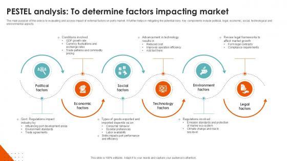 The main purpose of this side is to evaluating and access impact of external factors on ports market. It further helps in mitigating the potential risks. Key components include political, legal, economic, social, technological and environmental aspects.This Pestel Analysis To Determine Port Terminal Industry Ppt Template from Slidegeeks makes it easy to present information on your topic with precision. It provides customization options, so you can make changes to the colors, design, graphics, or any other component to create a unique layout. It is also available for immediate download, so you can begin using it right away. Slidegeeks has done good research to ensure that you have everything you need to make your presentation stand out. Make a name out there for a brilliant performance. The main purpose of this side is to evaluating and access impact of external factors on ports market. It further helps in mitigating the potential risks. Key components include political, legal, economic, social, technological and environmental aspects.